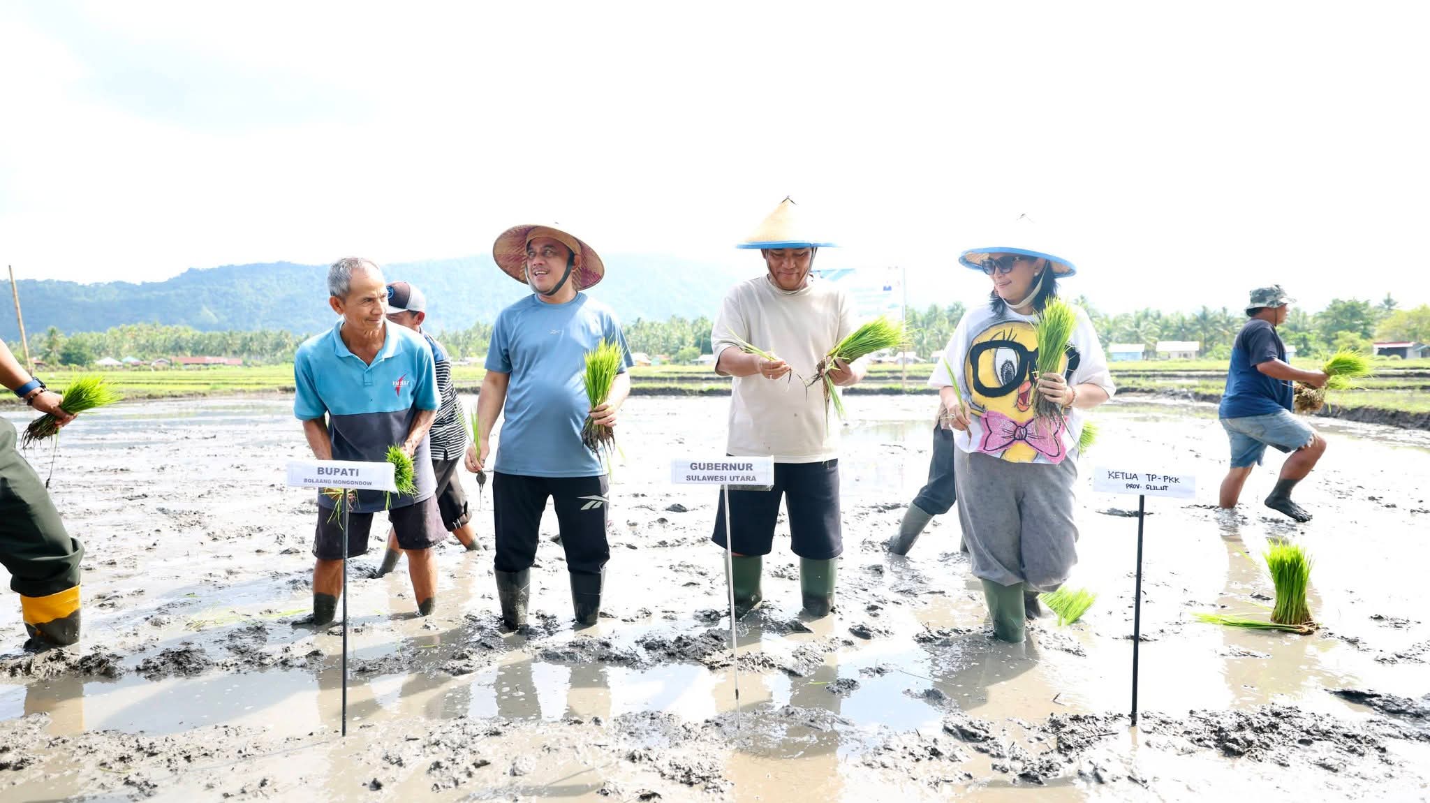 Gubernur menanam padi juga didampingi Ketua TP-PKK Sulut, Ny. Anik Yulius Selvanus, Bupati Bolmong Yusra Alhabsyi, serta jajaran Forkopimda daerah setempat.