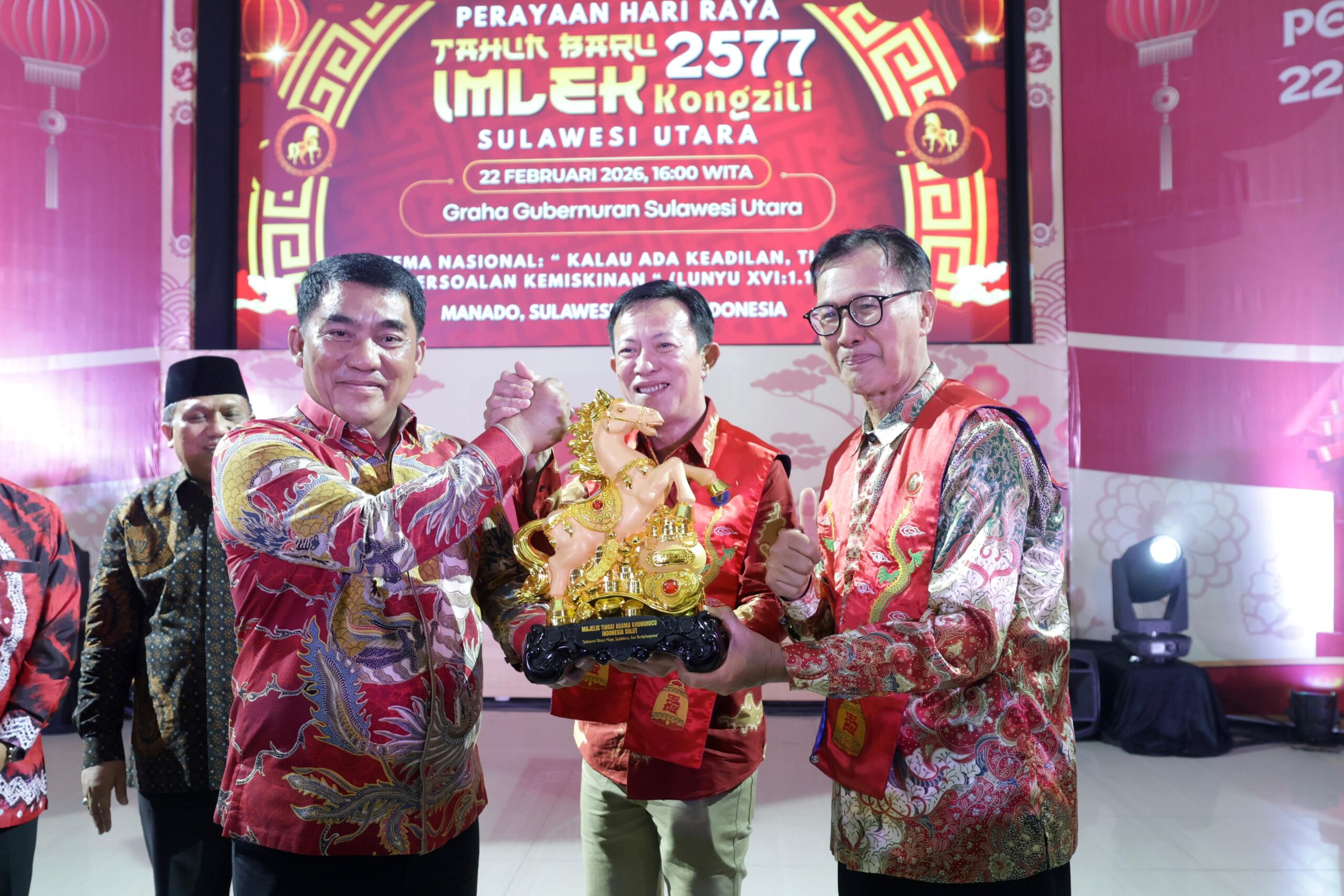 TAJUKSULUT – Gubernur Sulawesi Utara (Sulut), Yulius Selvanus, menghadiri perayaan tahun baru Imlek 2577 Kongzili tingkat provinsi, di Graha Gubernuran, pada Manado, Minggu 22 Februari 2026.