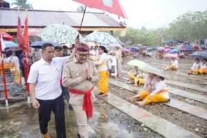 TAJUK BOLMONG – Penjabat (Pj) Bupati Bolaang Mongondow (Bolmong) Limi Mokodompit, menghadiri Perayaan Galungan dan Kuningan di Desa Mopugad, Kecamatan Dumoga Utara, yang berlangsung di Pure Puseh Desa Adat Mopugad, Rabu (2/8/2023).