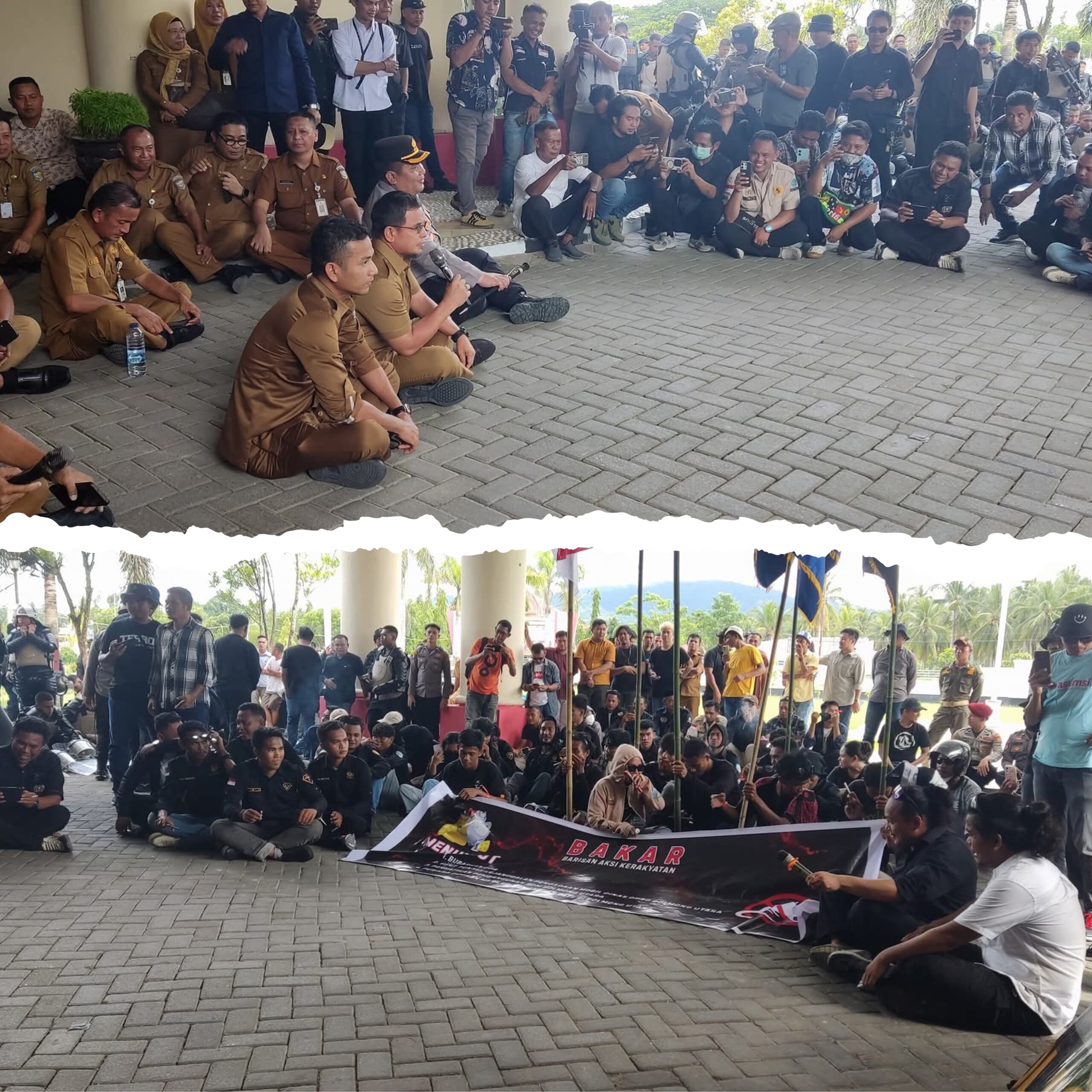 Dihadapan kerumunan puluhan masa aksi Bupati Bolmong Utara Sirajudin Lasena dan wakilnya Mohamad Aditya Pontoh memilih langkah sederhana namun sarat makna duduk melantai dan bersila di pelataran depan kantor Bupati berbaur dengan massa aksi.