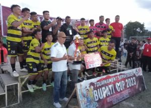 Bupati Limi Mokodompit dalam sambutannya mengucapkan selamat kepada tim sepak bola yang berprestasi terbaik dan mampu menjuarai Iven Turnamen ini.